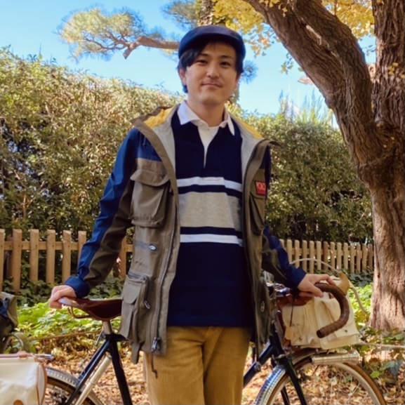 今回は、自転車ツアーの際のスタイル!クラシックなベレー帽、フィールドジャケット、コーデュロイのニッカーボッカーズ、、僕の好きな陰陽ミックススタイルで登場!(全く違う感覚を組み合わせる事)