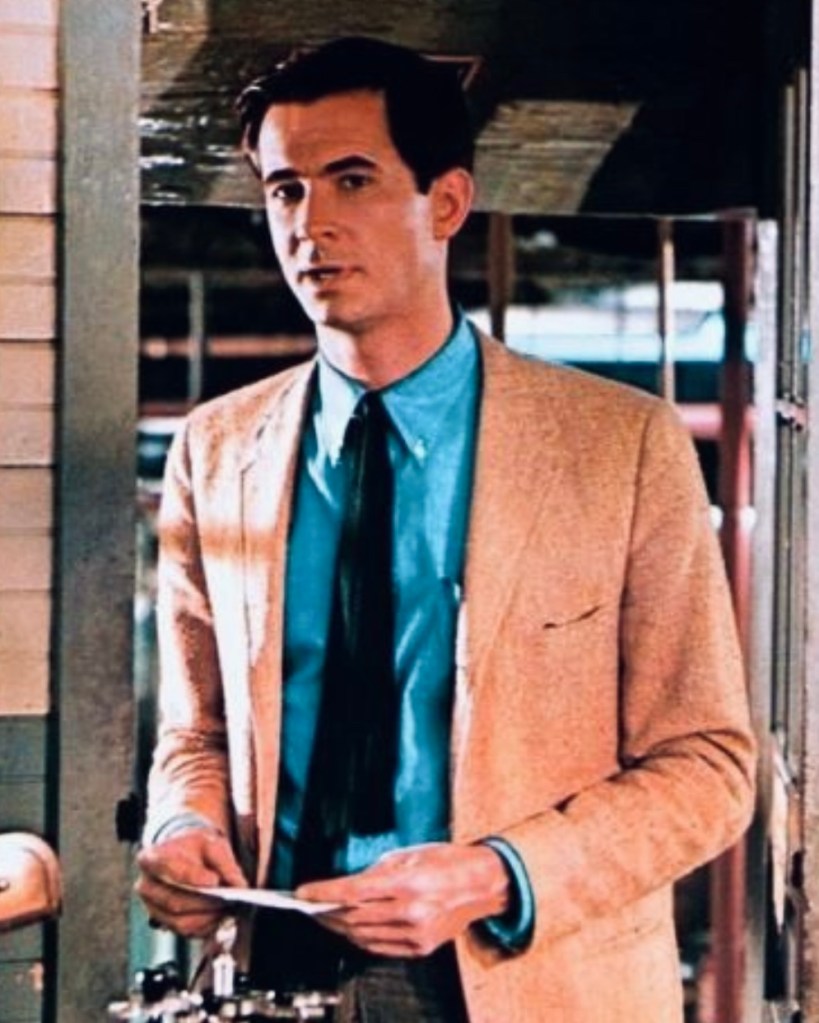 その際、スリムなニットタイを締めることで、全体のカラーバランスを取ることができます。パーキンスは、必ずシャツのカフをロールさせます。胸ポケットのペンにも注目!