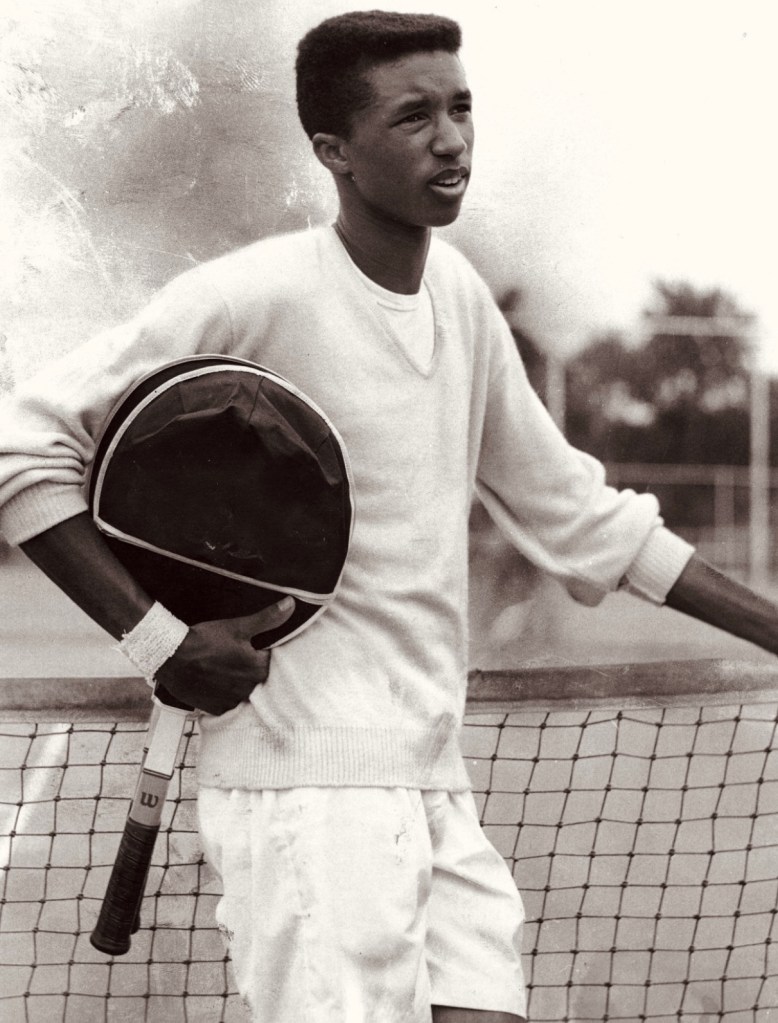 USAオープン覇者のアーサー・アッシュ、白Tに生成りのVセーターを合わせる憎さ!(白黒写真なので、セーターは淡いカラーという意味で生成りと言いました)