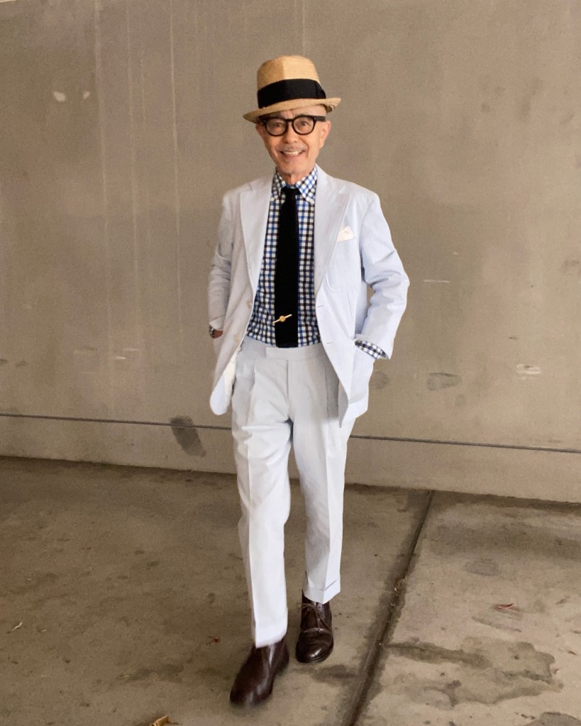 夏の王道、シアサッカースーツ、合わせるシャツは、大きなマルチギンガムチェック。鉄板の黒ニットタイで締めます。僕は、数シーズン毎にスーツを作りなおしています。やはり、夏素材は傷みが早くネックの汚れも酷くなるので。その際シルエットとサイズをちょっとイジる程度の修正をかけます。