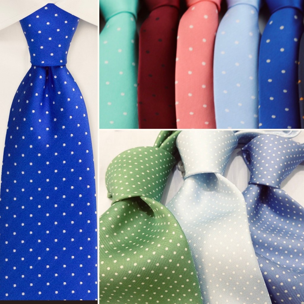 綺麗めニートネスの時代は続くと思われるので、ポルカドットタイのベースの色をブライトカラーにして水玉は白抜き!ロイヤルブルー、ライトブルー、ピンク、イエロー、ライトグリーン、etc. ロンドンストライプシャツにも同様の色を持ってきて、合わせれば、綺麗めコーディネートになると。水玉に期待!