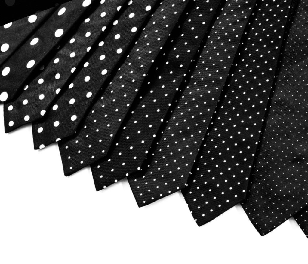 水玉は、大きさで、主に3種類に分けられて呼ばれています。大きい水玉から、コインドット、ポルカドット、ピンドット、他にももっと大きなバルーンのような水玉が、色々ありますが、ネクタイには不向きな故ありません。