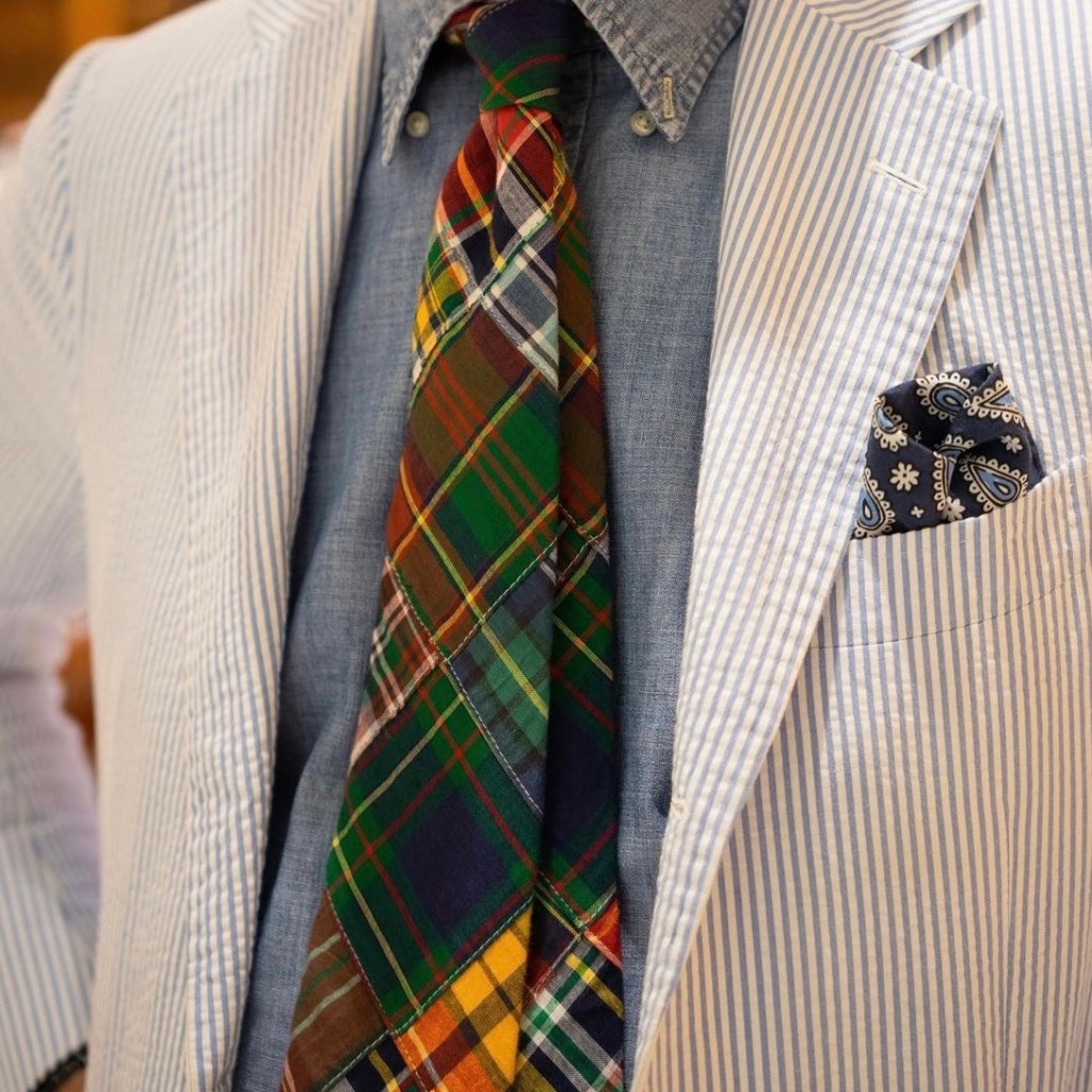 マドラスのネクタイもウィークエンドスタイルとしてカッコいいです。薄いコットン地なので、シワになり2シーズンくらいしか保たない贅沢品です。ただし週一で、綺麗なプレーンノットで結んで使用すれば、長持ちします。