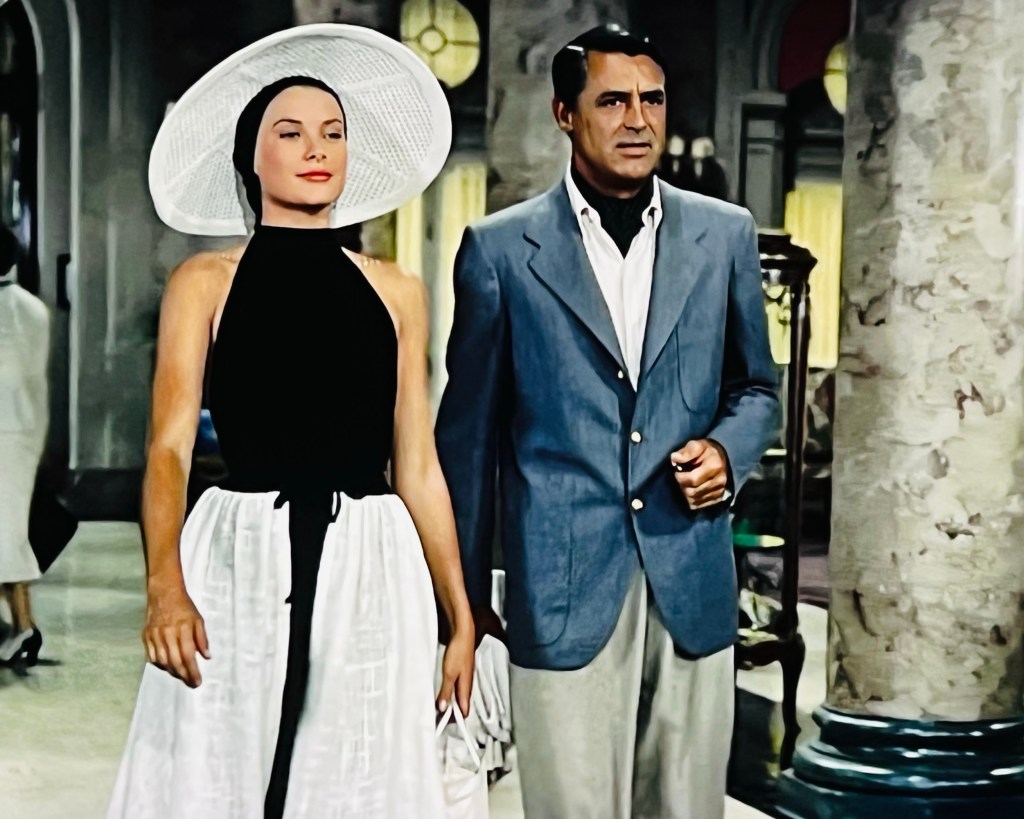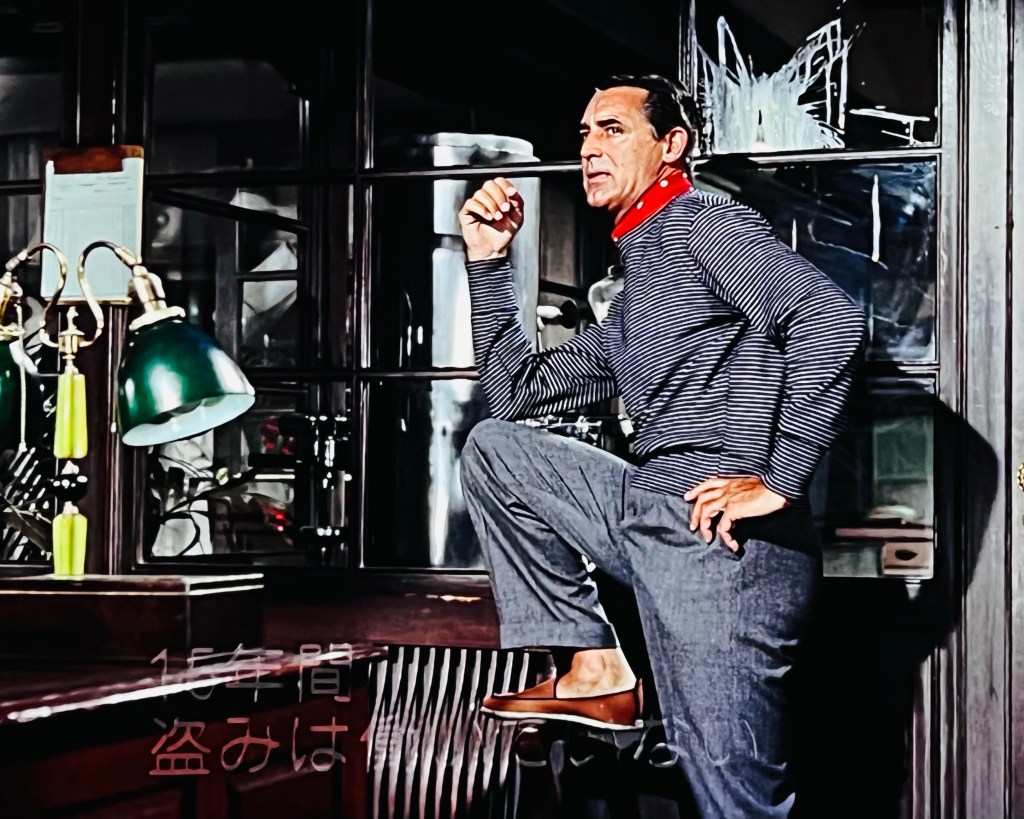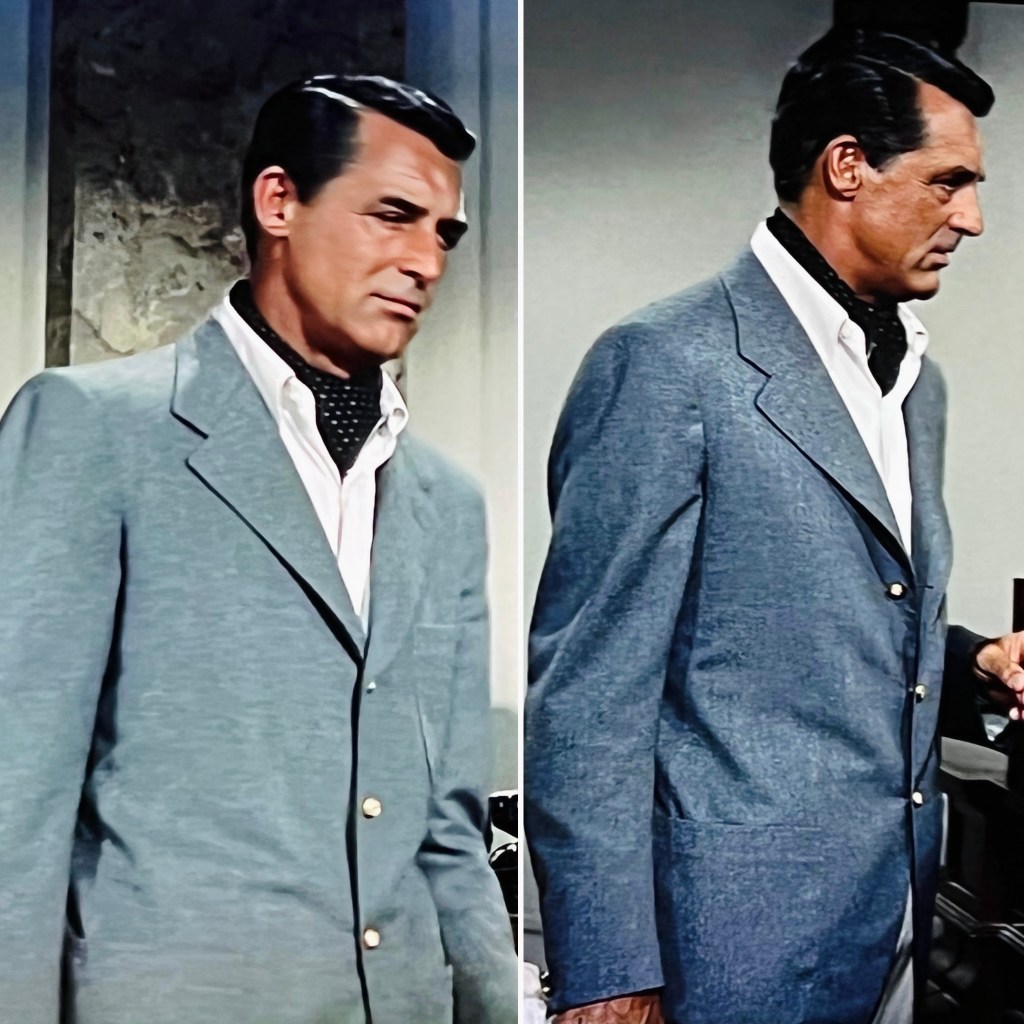 一つ言えるのは、この映画が公開されたのが1955年、アメリカではアイビーがようやく学生ルックから大人のスタイルに認識された時期に当たります。ですから、流行に早いハリウッドスターのスタイルでさえも、まだまだアイビーのディテールがまちまちで未完成でした。(60年前後のアイビー・スタイルは、凄くクールになってますので、その後一気に広まってきたのでしょう) さすがのスタイリッシュなケーリーも英国風着こなしと違いアイビー・スタイルは苦手のようです。でもトレンドだからちょっ取り入れてみようと考えたのが、この映画のスタイルかなあ〜と。その後の映画では、本来の彼のもつエレガントな英国調スタイルに戻り、磨きがかかってきてますから、やはり本来の自分の得意なスタイルに自信を深めたのでしょう。