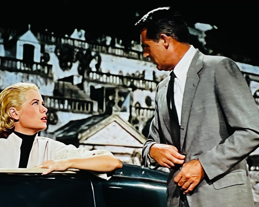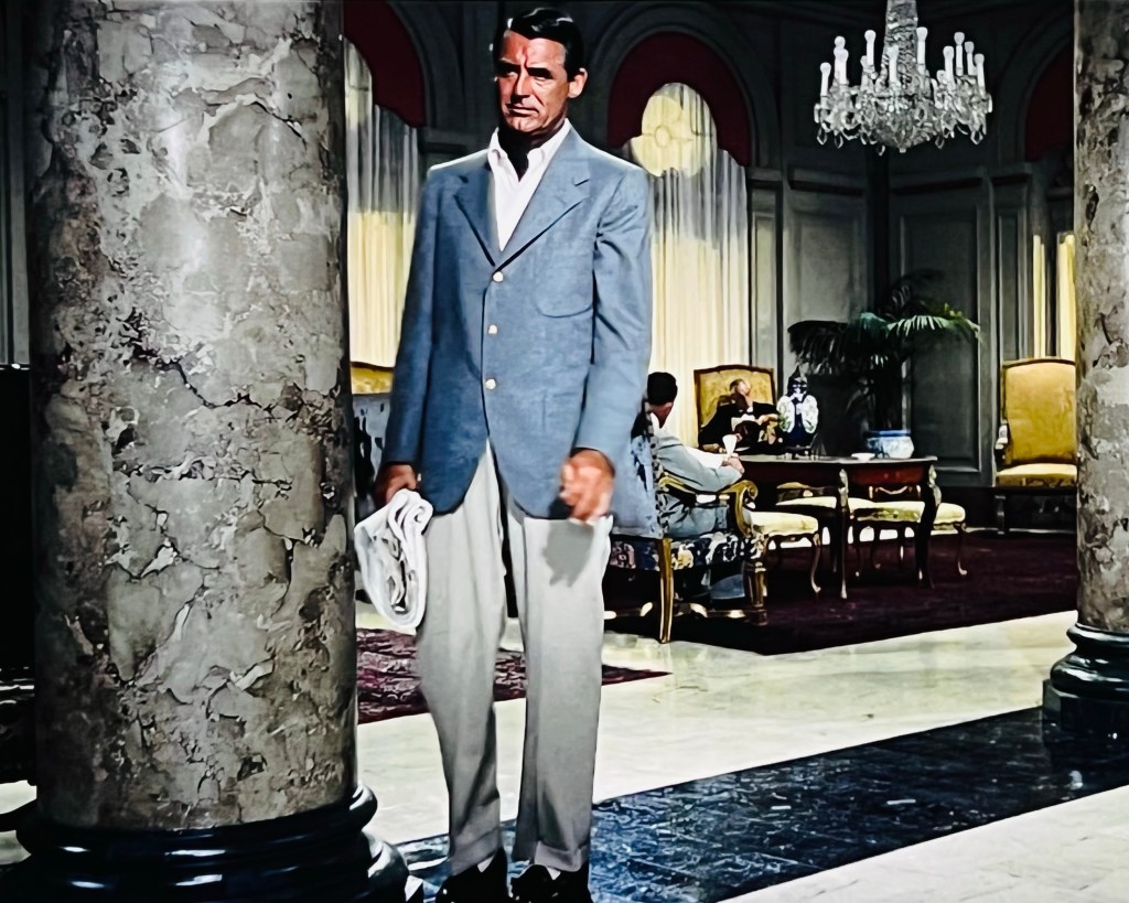 さすがケーリー・グラント、得意のグレースーツ・スタイルは完璧!この後の “北北西に進路を取れ” を彷彿!グレースーツの帝王と言えるでしょう。