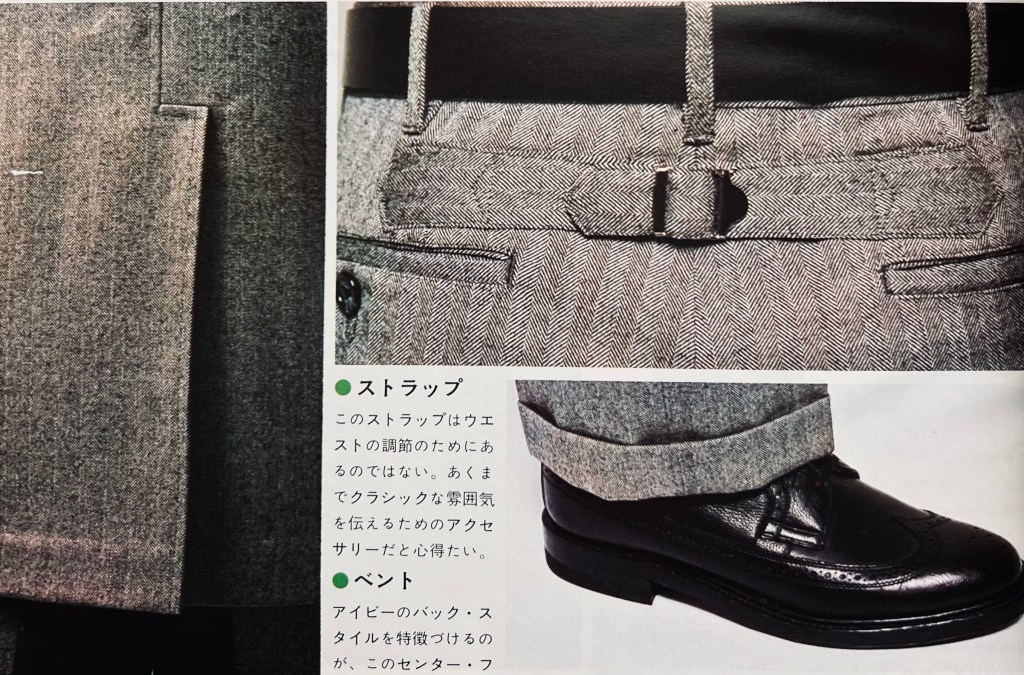 フックベントと同じくらいアイビーディテールにとって欠かせないのは、バック・ストラップ。パンツ後ろ中央に座るストラップです。サイズ調整に使えるとの事ですが、これはそれほどの効果はないです。それより、お尻の落ちる日本人には、目線が少し上になるので、美尻効果があります。責任は持ちませんが。