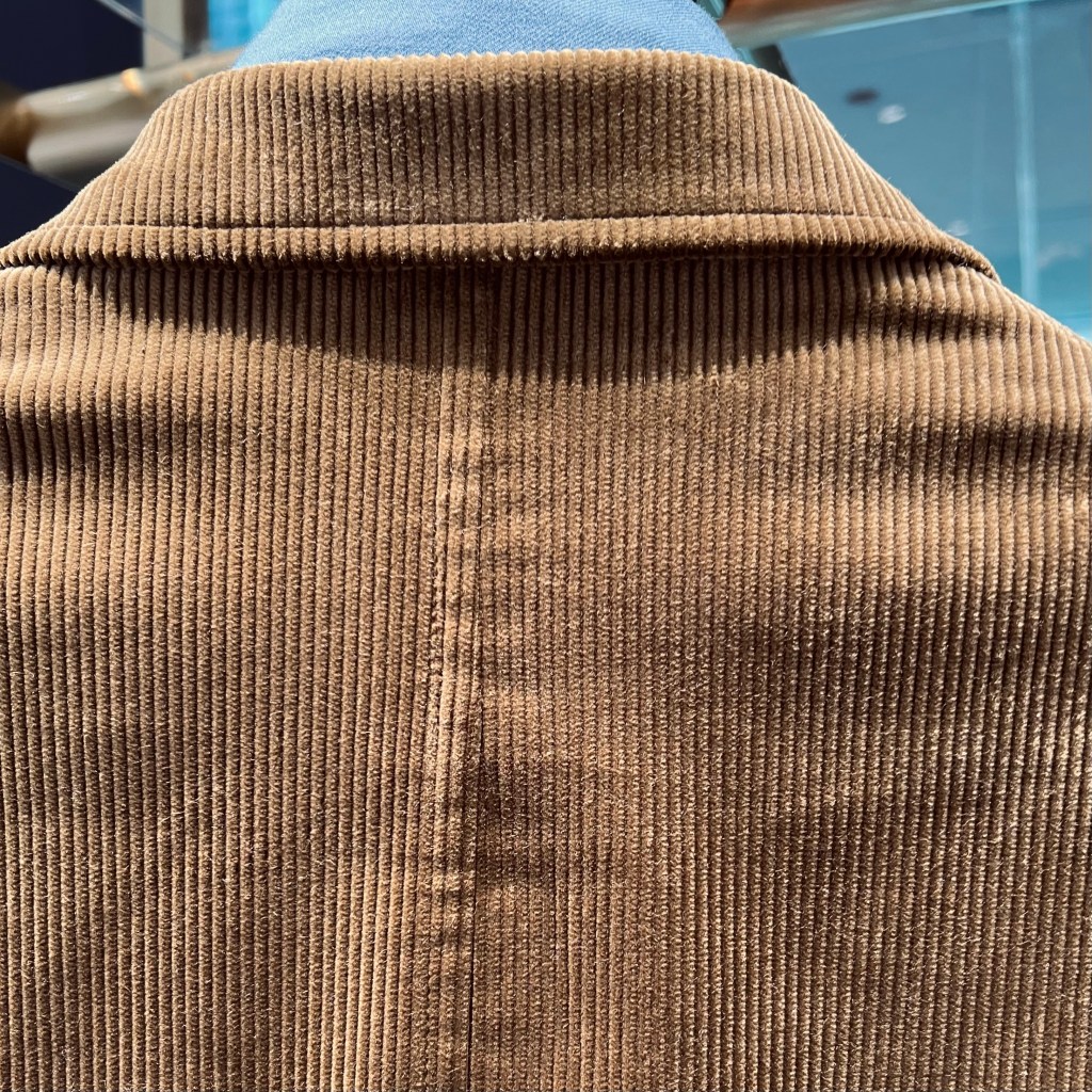 ディテールの中でも特にステッチが重要かと考えます。僕にとってステッチのないジャケットは、〜〜でない。しっかりかかったステッチの凸凹影(陰陽)をみると何故かホッとしますね。ラペルのステッチは勿論ですが、ショルダー(肩ラインと袖付け)、袖、背中、ポケット、ことごとくステッチ三昧!一般的には6mm前後といわれてますが、4~8mm、その方の体型つまりサイズ加減で。ステッチの陰が綺麗に出てるかどうかには、技術は勿論、生地も影響します。ハリスツィードやコーデュロイの凸凹は、実に綺麗ですね。