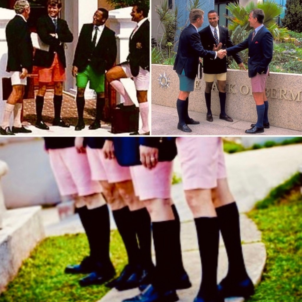 そこでお勧めしたいのがバミューダ・ショーツ、それに必ずストッキング、ひざ小僧までのいわゆる長靴下をはく。すなわち白シャツにきちんとネクタイを結び、それに黒靴なら夏場の通常着として堂々たるものである。