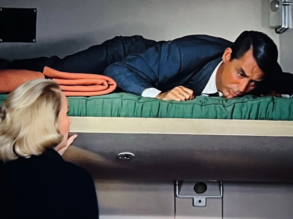 付録: 当時の寝台列車、ファーストクラスですが、上の荷物入れがベッドにもなるが、とてもロマンチックな気分にはならないでしょうね。コミカルなシーンでした。