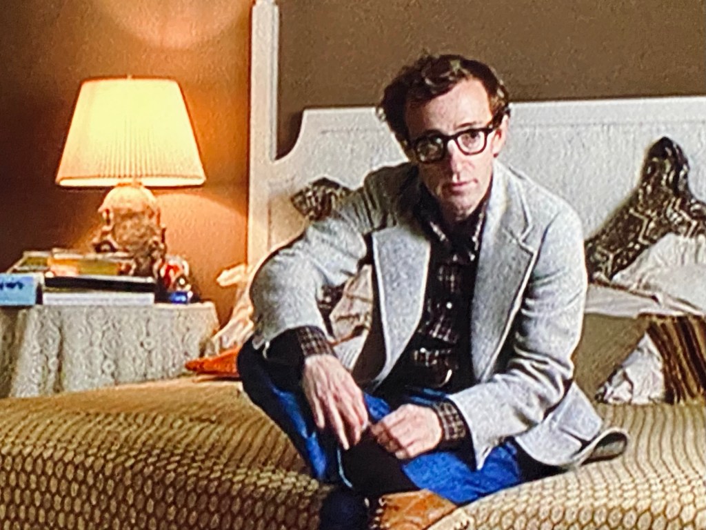 ロスアンジェルスでのパーティ・シーン、ポール・サイモンが音楽プロデューサー役で出演、ここでは、圧巻のダイアンのスーツ・スタイル、POLOスタイルのベージュ・スーツ、ツータック・パンツに、当時トレンド入りしたウォッチポケットが付くと言うオシャレぶり。ウディのニュートラ・ジャケットには、ステッチが入っていません。この頃、ブリティッシュ・スタイルへの傾斜を強めていたラルフは、ステッチを省いたジャケットも多く発表していました。