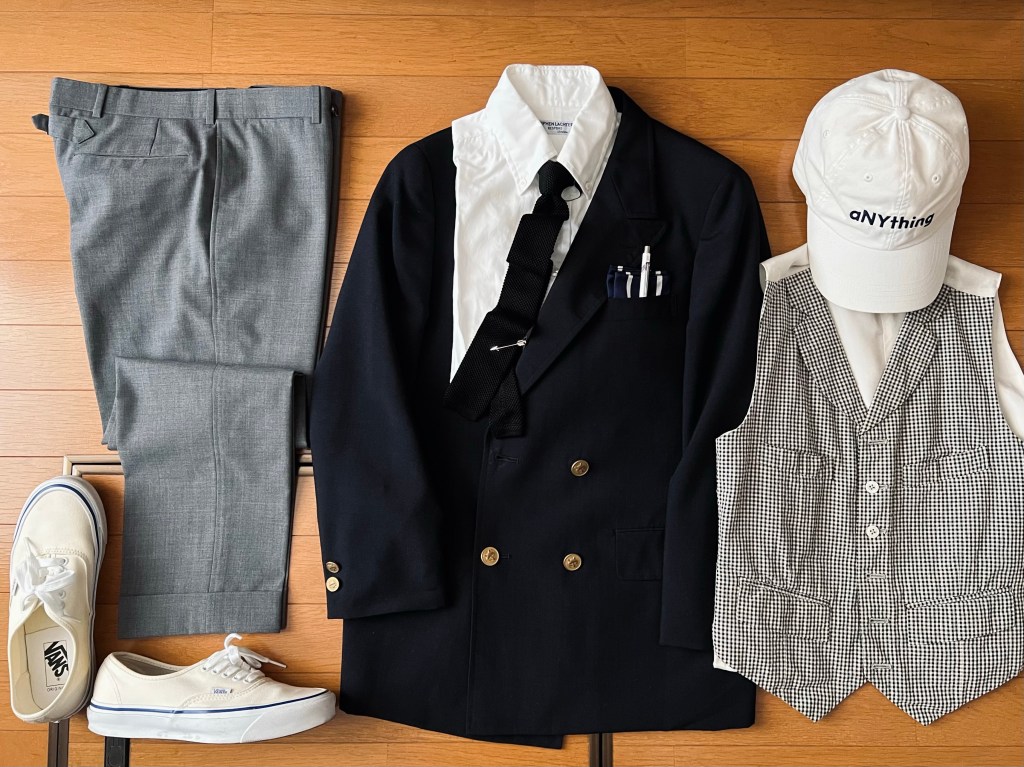 紺ブレとグレーパンツ、白ボタンダウンはキープして、ストリート感覚をプラスしてみました。それが、キャップとスニーカー、これを入れ替えするだけで、簡単に今どきタウン・スタイルとなります。ネクタイも黒ニットタイに変えます。
