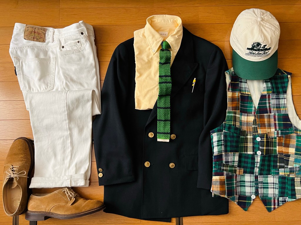シャツにピンクのボタンダウン、タイをグリーンのホリゾンタル・ニットタイ、それにチルデン・ベストを加えてプレッピー風に。パンツをシアサッカー、靴をホワイト・サドルシューズにしてサマーを意識。