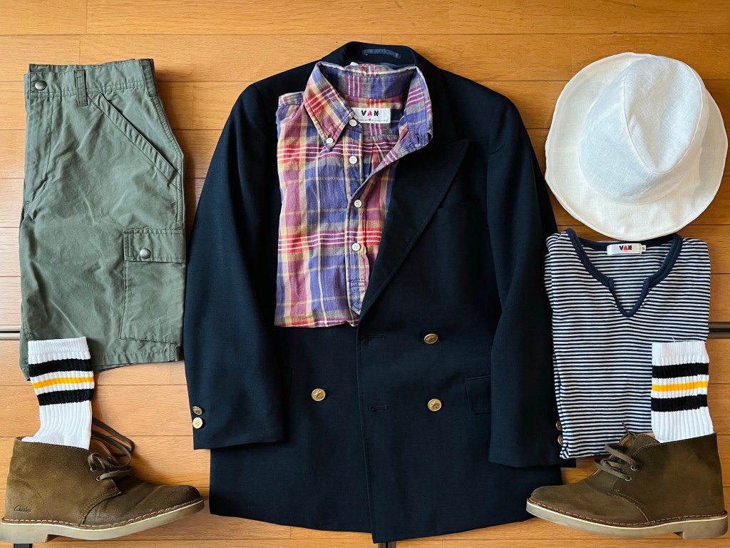 クレージー・マドラスのバミューダ・ショーツを中心に組み立て。ホワイト・シャツで色柄が過剰になるのを避ける。中のTシャツ、肩にかけたスエット・シャツをバーガンディで纏める。デザート・ブーツ、アイビー・ベルト、ホワイト・バケット