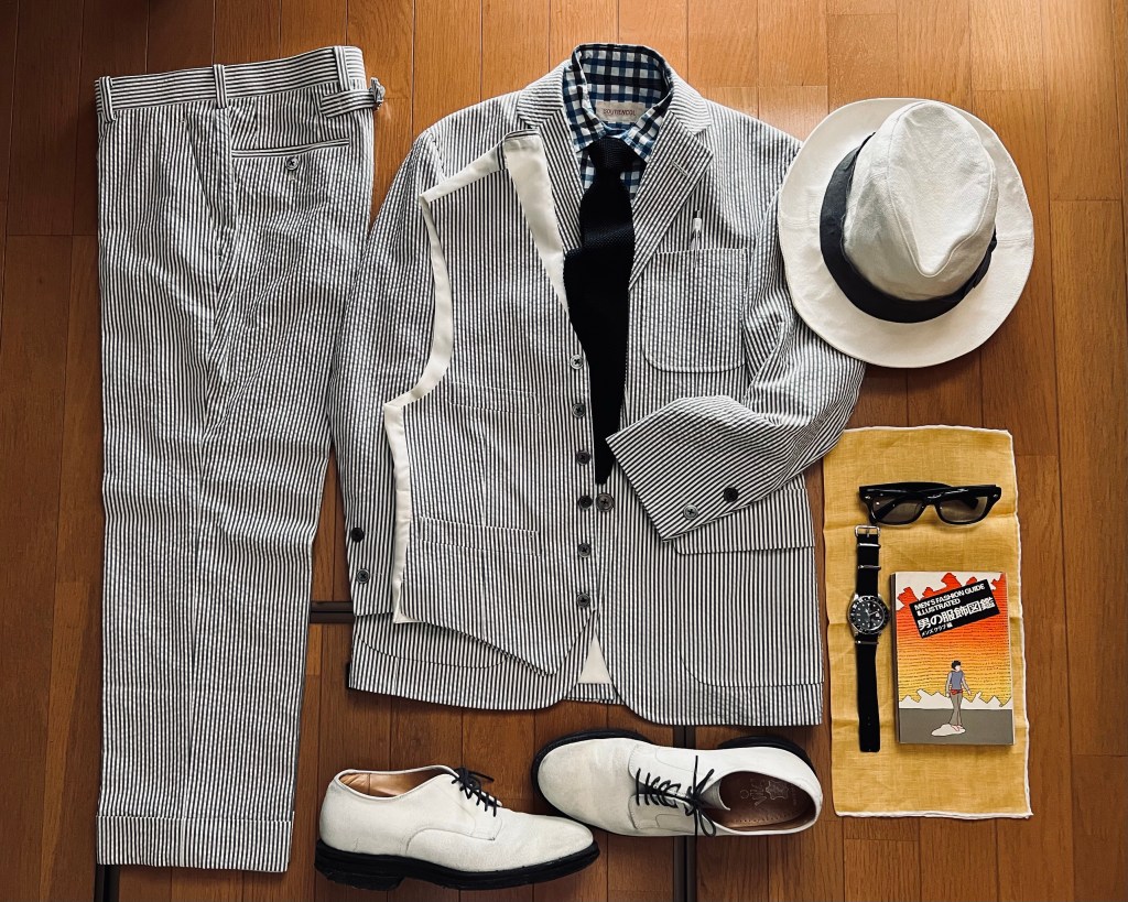夏の主役!シアサッカー生地のスリー・ピース・スーツ、それをバラバラにして其々を活用して組み立てができます。ジャケット、パンツ、ベスト、別々で。そこで、火曜のコーディからは、そんなスタイルで。