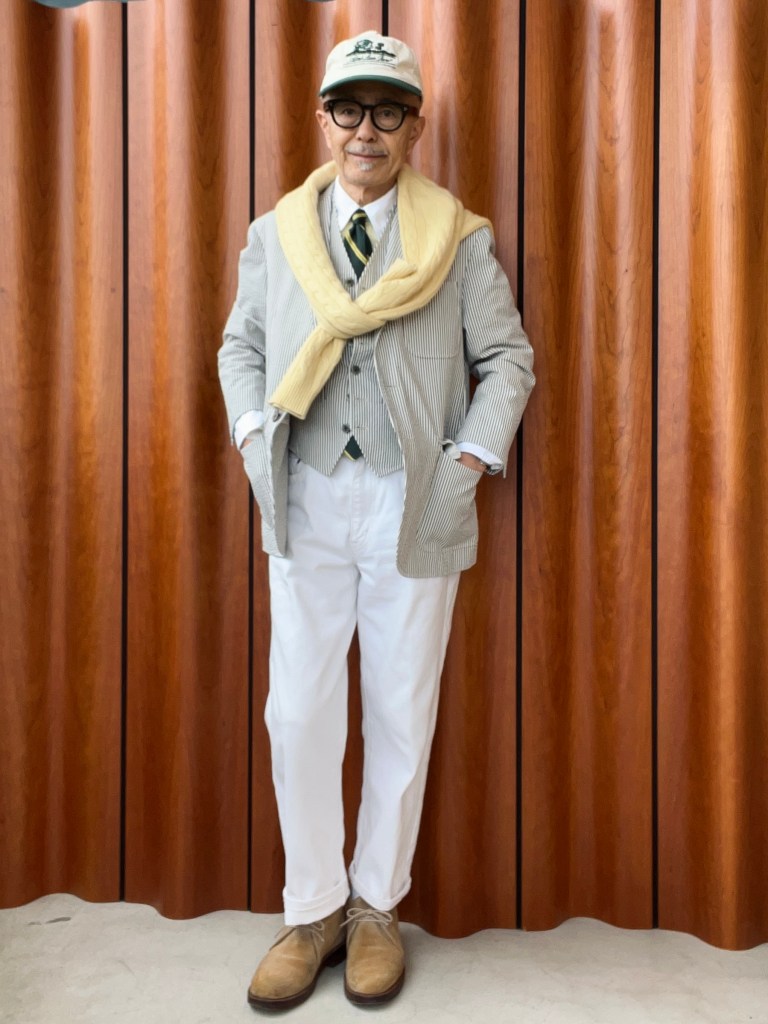 水曜 : ベスト付きのジャケット・スタイル!それにホワイト・ジーンズを合わせ、今シーズンらしい香りを。ホワイト・ジーンズに合わせるシューズは、ダーティー・バックス。相性がいいです。レジメンタル・タイとキャップをグリーンで合わす。さらに、肩に掛けたセーター、シャツ、タイの色をイエローで。色数を少なくする事でスッキリ感が増す。