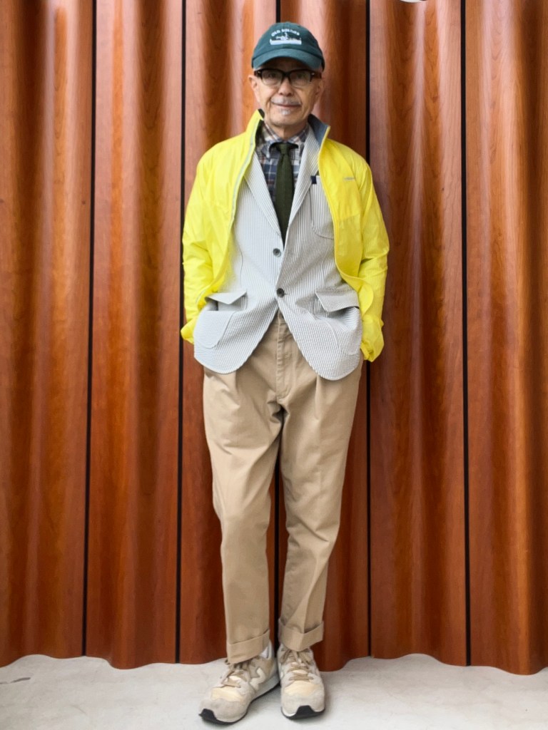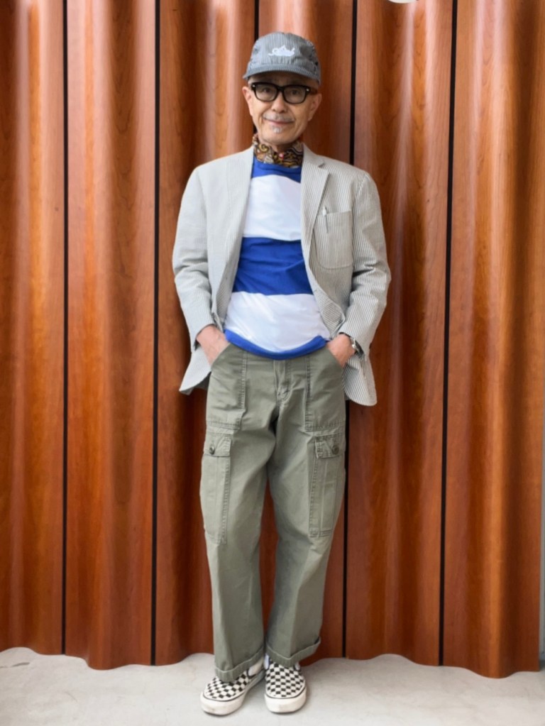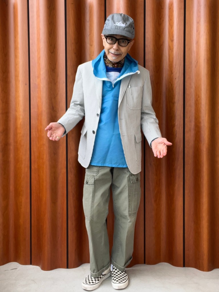 金曜 : シアサッカー・ジャケット!ナイロンのパーカーとミリタリー・パンツを合わせストリート感を前に出す。キャップとスニーカーもストリートよりに、VANSチェッカーボードのスリッポン・スニーカー。首元のコットン・スカーフで少しだけ大人っぽくする。(パンツにラインが入っているのは畳ジワでご愛嬌)