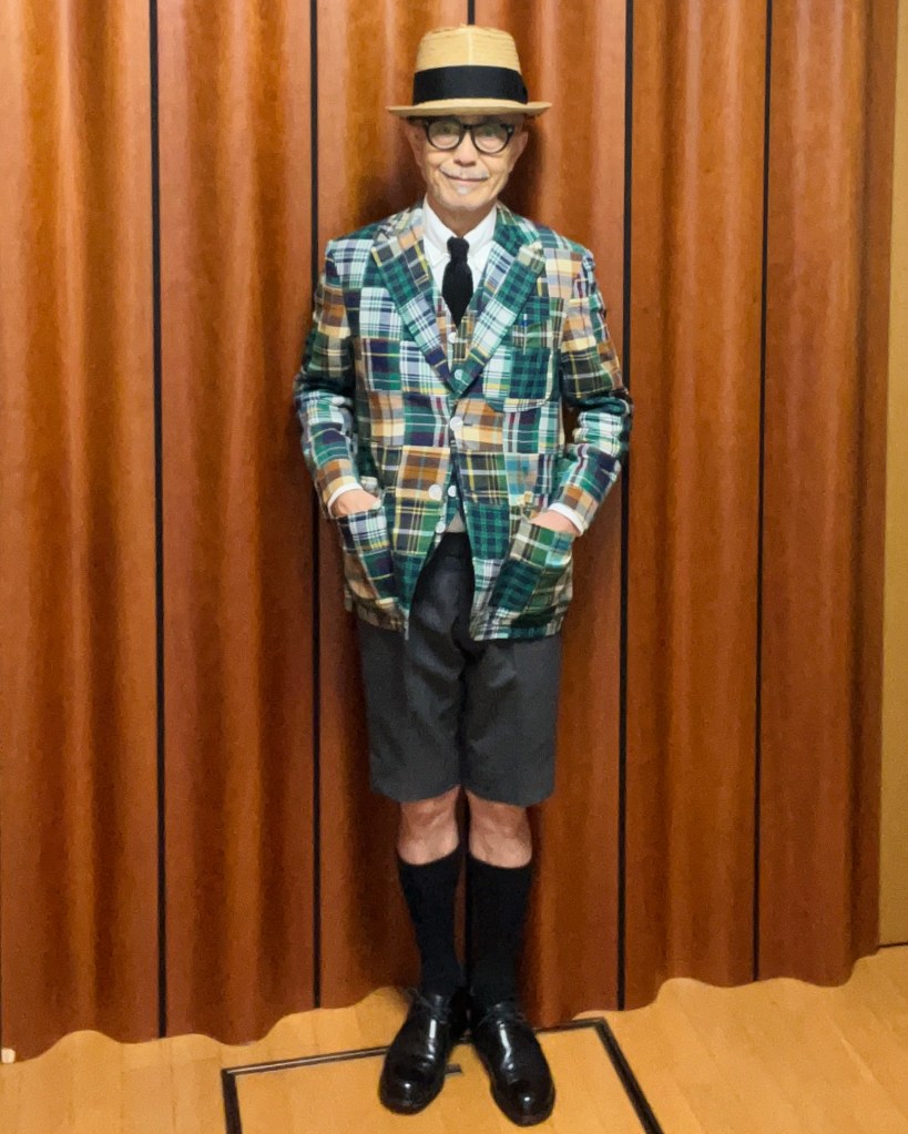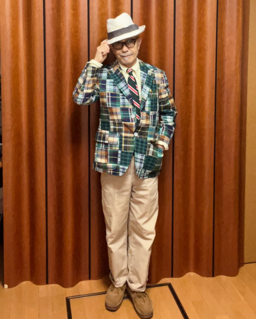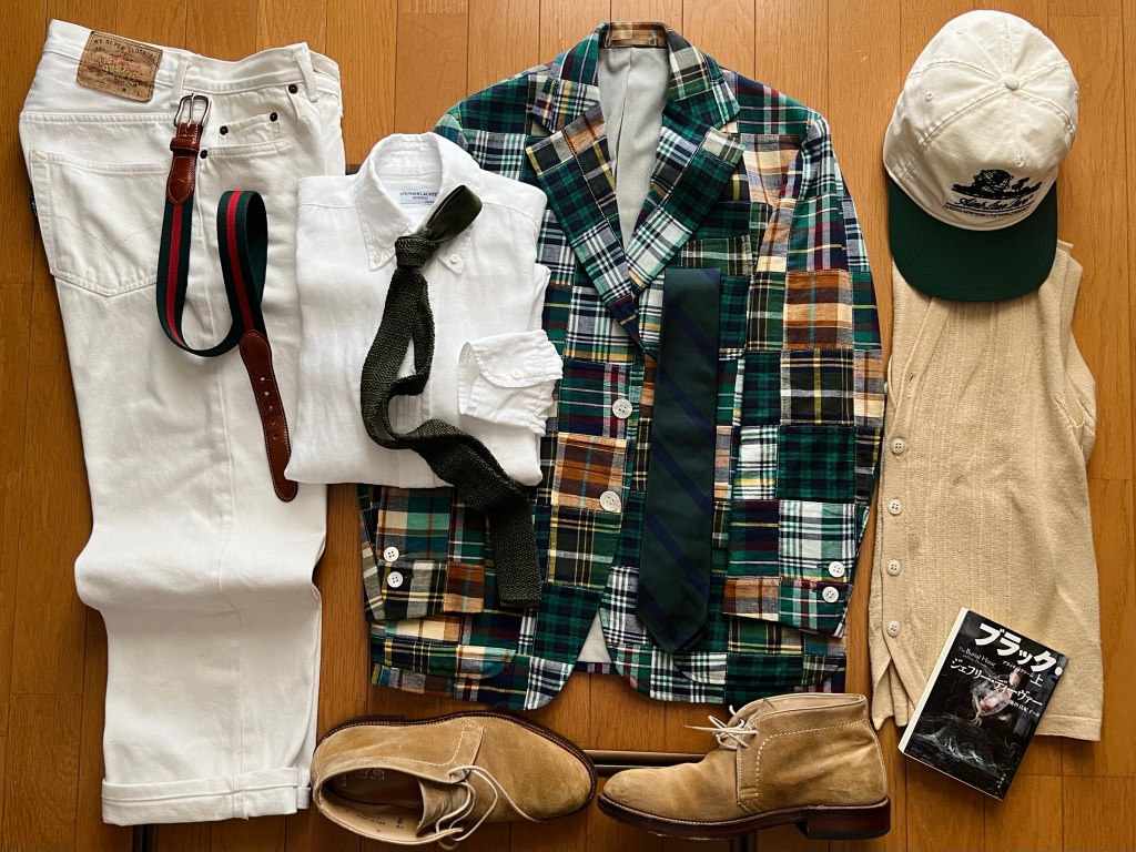 まずは、ジェントリーなスタイルから入ります。コットン・パンツとはいえ、ネイビーのパラシュート・クロス生地のパンツは、マドラスに落ち着きを与えてくれます。それに合わせてネクタイもネイビーとします。今日の場合、ハットにデニム地を持ってきたので、タイもデニス地にしましたが、ニットタイはピッタリです。シャツは、イエローのクレリック・シャツ、クレリックは衿とカフ部分が白なので、ゴッチャリとしたクレージー・マドラスに合わせやすいです。勿論ホワイト・シャツが鉄板な合わせです。ボタンダウンでなければいけないのかと迷う方には、是非!洗いざらしなボタンダウンでと答えます。マドラス・チェックはアイビーを代表する柄なので、やはりアイビーなシャツが相性良いかと考えます。たまには、オックスフォード地レギュラーやラウンド・カラーにタイバーなんて気取った合わせも楽しいですが。シューズは、ホワイト・バックスを選びましたが、ブラックのスリッポンなどもクールかと。