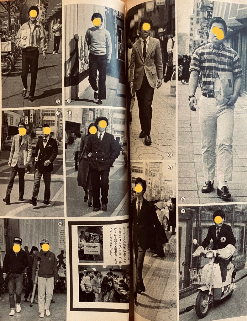80年代は、プレッピー・ブームとDCブランド・ブームがクロス、ニュー・カルチャーが台頭します。従来のアイビー・ルックは、ユニフォーム化して野暮ったく見え、しばし路線から外れます。その辺りの感覚は、”街アイ” からつかむことができます。
