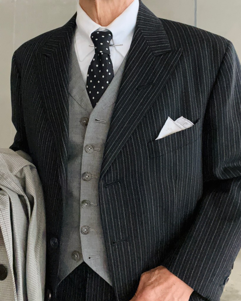 マルチなピンストライプ柄のブリティッシュ・スーツ、英国調な雰囲気を出したいです。そこで、グレーのベスト、ドット・タイを取り入れ、カラーピンを刺しました。胸には、ホワイト・コットンチーフをスリーピークスで、シューズはブラック・サドルシューズを。これは僕の遊びみたいなもので、プレートゥやオカメがよろしいかと。ブリティッシュ・スタイルの肝は、削ぎ落としてシンプルに装うことでしょうか。