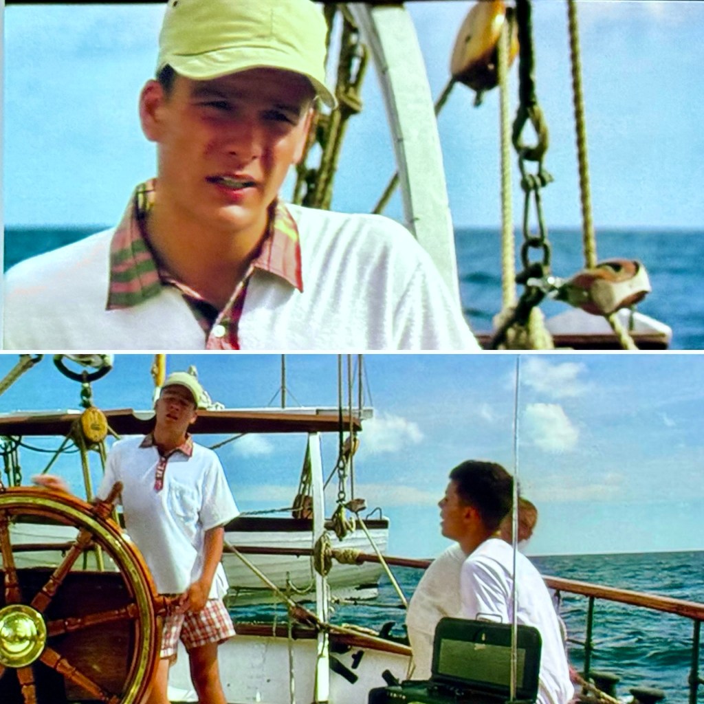 アルバトロス号に乗り込む若者たち、オーソドックスなアイビーと言うよりは、今からみるとプレッピー風な着崩しが観られ各人バラバラのカジュアル・ルックがいいね。