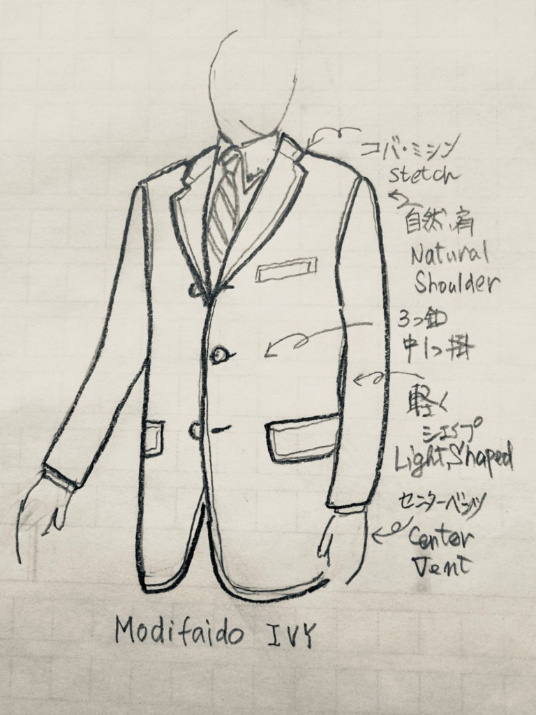 その後、一般にまで広まったオーセンティック・モデルは、背の高い人だけが似合うズン胴長方形スタイル。そこで一般体型の人にも受け入れられようモデルの修正が始まる。ディテールを修正、上着丈を短くして軽く絞りも入れて万人体型モデル<モディファイド・アイビー>の誕生となる。