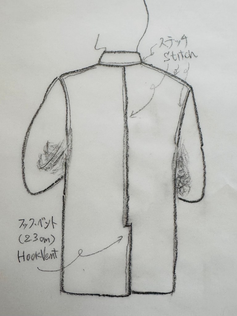 アイビー・スタイルの特徴の一つ、フックベント。カギ型に曲がった深いベント、これが付いてないとアイビーの香りがしてこない。アイビー・ディテールは、多くは英国スポーツ・シーンから出てきたがベントは乗馬服から。ベントの長さは、オーセンティックは23cm、上着丈が長い分深いベントとなる。長い方は25cm以上もあるが、万人向けになった ”モディファイド・スタイル” では20cm位のフックベントとなる。