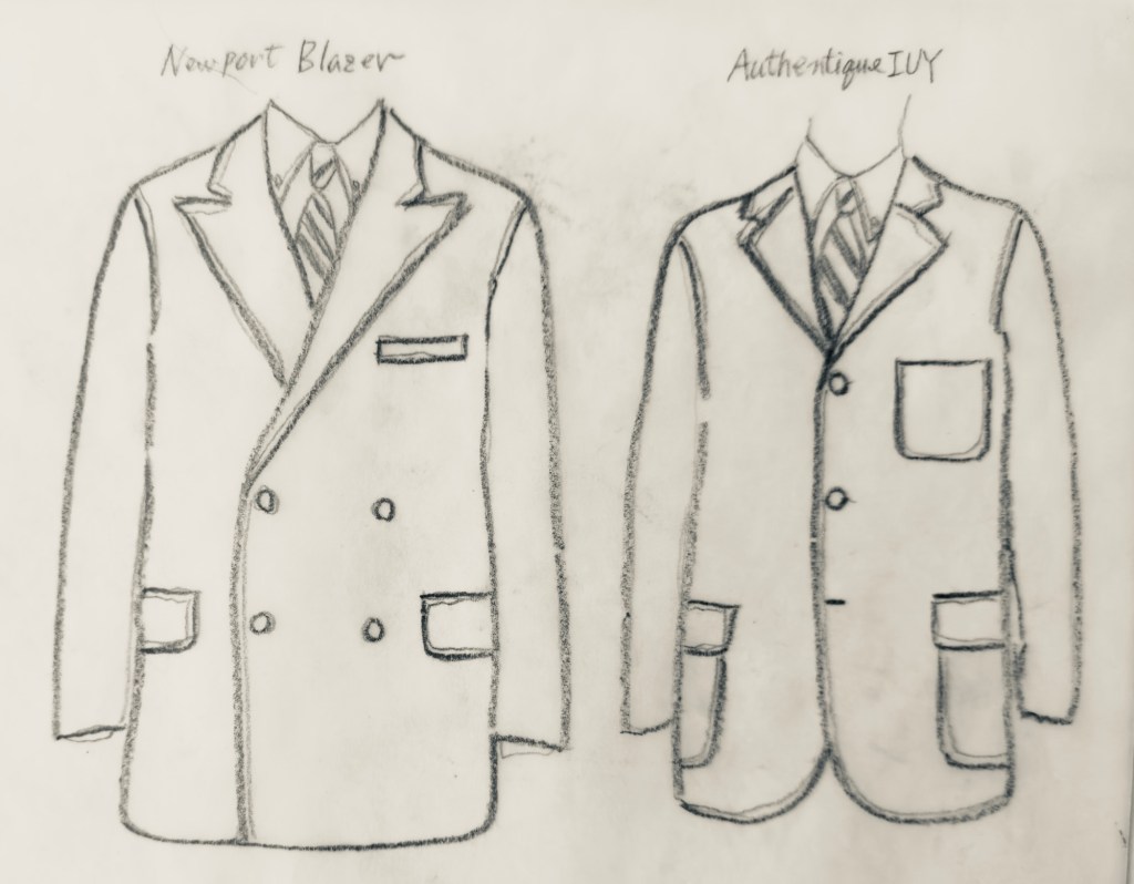 多くは、シングルの三ツボタン、上二つ掛け。ボタン・スタンスは12~13cm と広めに取るため、長方形シルエットが似合う背の高い人だけのモデルだった。そこでモディファイド・モデルで万人向けに修正、ボタン間隔は10~11cmとなる。ボタンのサイズは、小さめで(18~19mm)、ボタンの位置にアイビーの特徴が出る。第一ボタンの位置は、胸ポケット位置より1cm下位で、第三ボタンは脇ポケットの横となり、その中間が第二ボタンとなる。このボタン間隔の広さとボックス・シルエットがアイビーの持つ魅力である。また、袖ボタンのスタンスも、2.5cmと広めとなる。