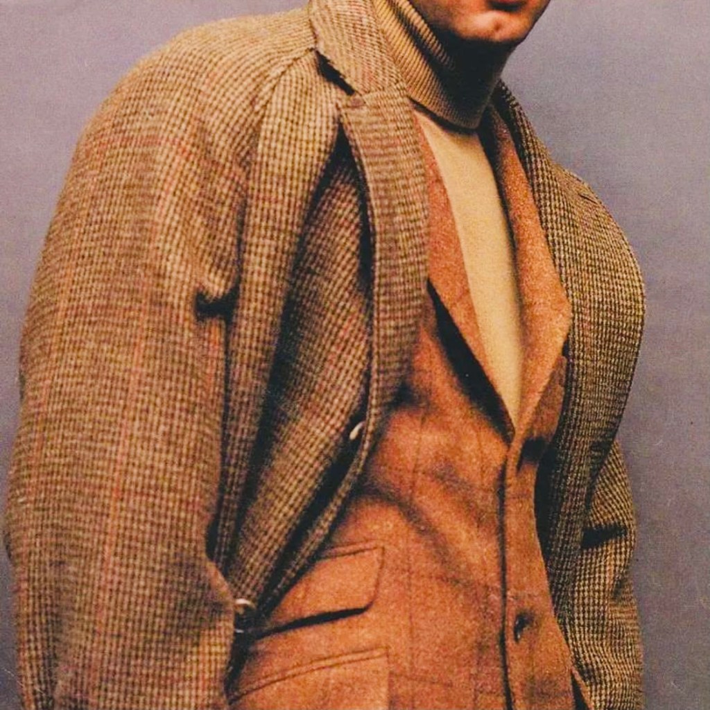 当時は、ツィードのスーツが大モテ。特にドニガルツィードはヘリンボーン並に目立つ。昨今は温暖化や暖房などで、ツィードは、コートとジャケットのみに使われてます。これ以上、温暖化が進むと、ツィード系スタイルができなくなり、メンズのウィンタースタイルとしては非常に寂しくなる。ツィードのない男なんて!