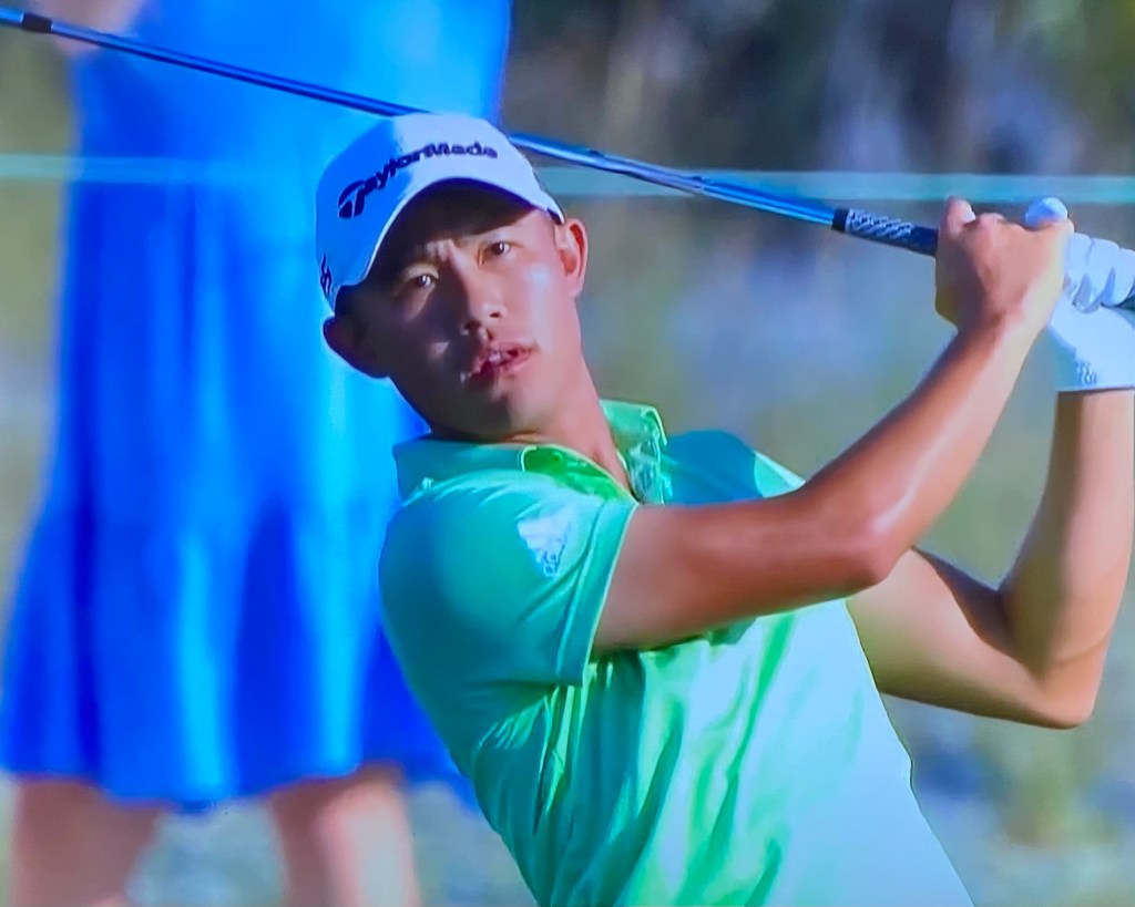 以下の二つのシーンが、大好きです。一つは、競技ウェアの上から、ツィードジャケットを襟立てで着ています。スポーツとテーラードの相反する合わせがカッコいい。