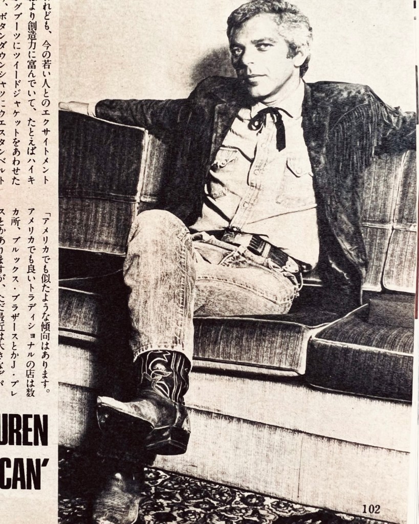 70年代に入り、オーセンティック・アイビーにも翳りがでてきて、コンポラ、コンチ、モッズ、サイケ、、、色々なスタイルが生まれてきました。その中でアイビー野郎のハートを掴んだのが、ウエスタン・スタイル。ハードでピュアなウエスタンではなく、今までになかったラルフローレンがまとう都会的な?ウエスタン・スタイル。