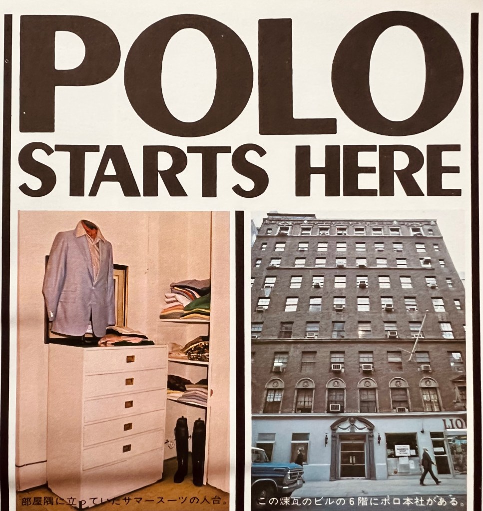 それが、僕が ”POLO” ブランドの日本導入を思い立った始まりでした。73年、幸運にもOKの連絡が来て早速 NY に飛んで行きました。交渉などはラルフの実兄の担当だったので、残念ながらラルフとは握手できませんでしたが無事締結。( 始めから分かっていたような話ですが、結局契約は2年間限定で、日本市場のマーケットリサーチ役みたいな感じの位置 ) 本番は、VAN と西武が戦い、結局当時最もブルミングデールに近いと言われた西武百貨店が落札。以後の経過は皆さんご存じの通り。