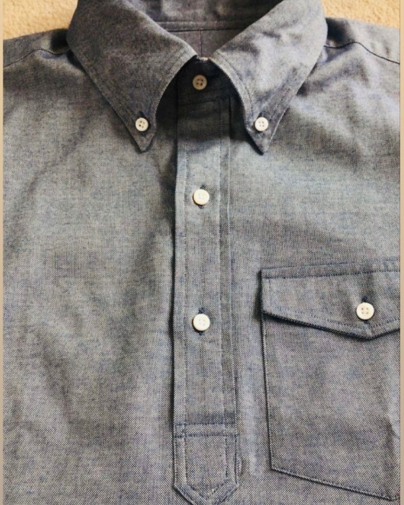 普通、前立てが衿腰から裾まで続くが、写真のように、ハーフ・プラケットのものは、プルオーバー・シャツといいスポーティーな装い。前立ては、洗いにも強くステッチの表情も生きてくる。