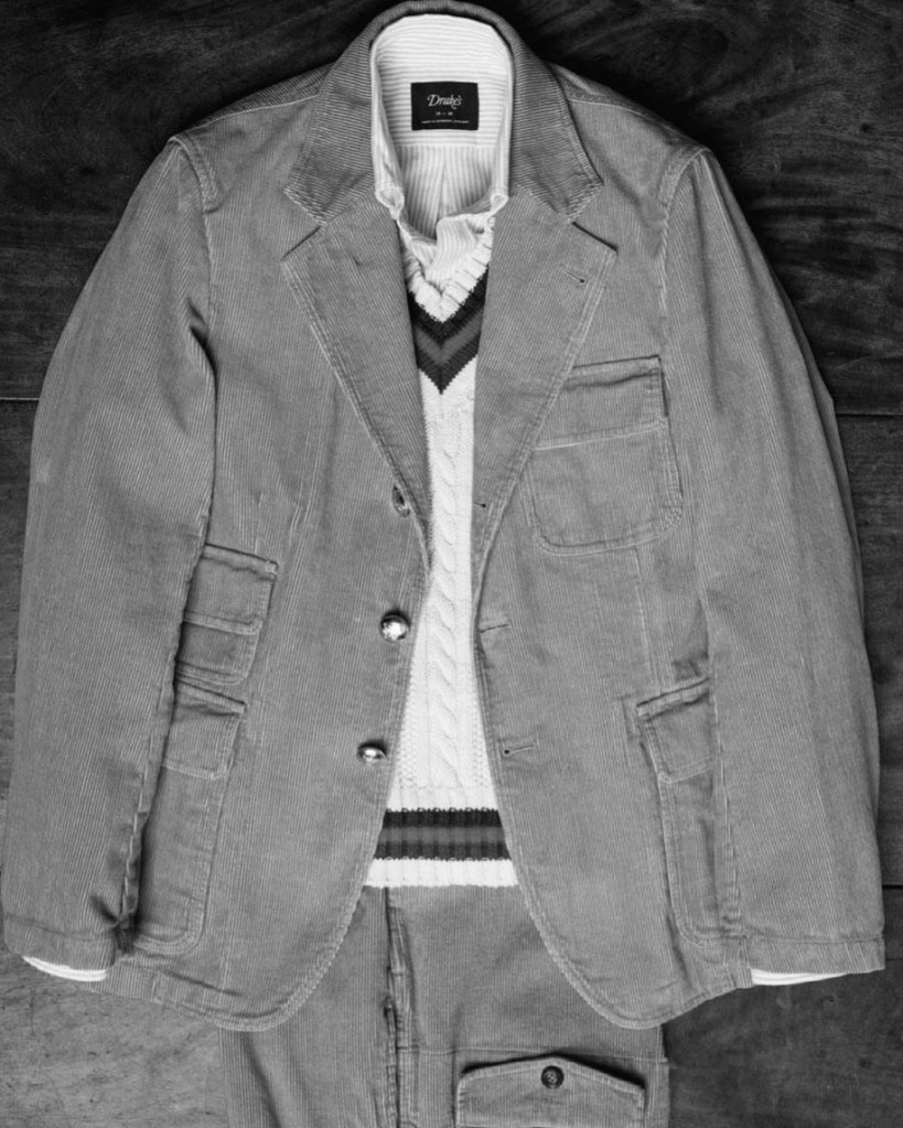 スポーティーなシーンでは、パッチ&フラップポケットも登場。ボタンも皮の組みボタンに。ブレザーでは、メタンボタンとなる。