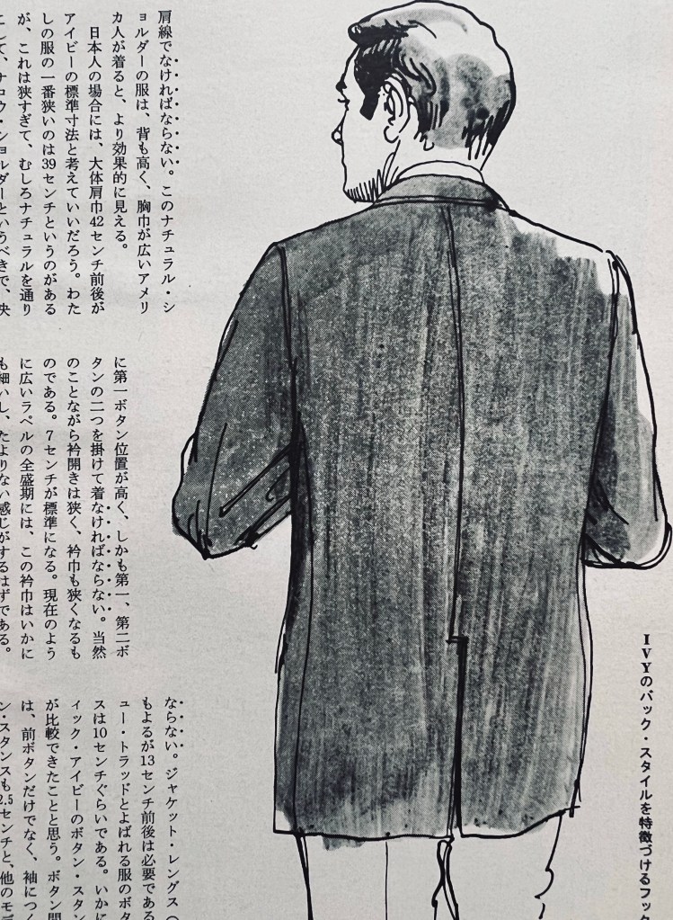 アイビーは、バックスタイルに特徴がある。カギ型に曲がった深いベント、これ無くしてはアイビーは語れない。ベントの深さは、23cmが基準。170cm 以下の我々は、20cm以下とならざるを得ない。高身長が有利なアイビーのなせる技。