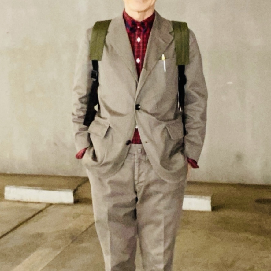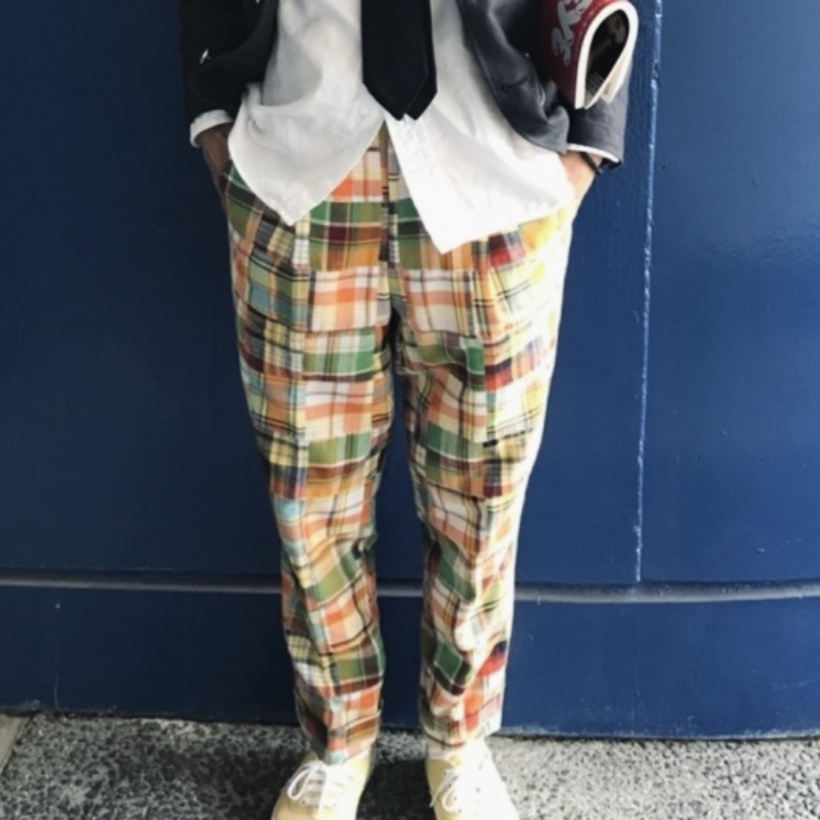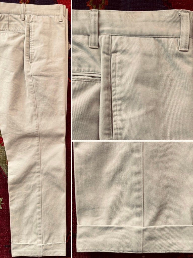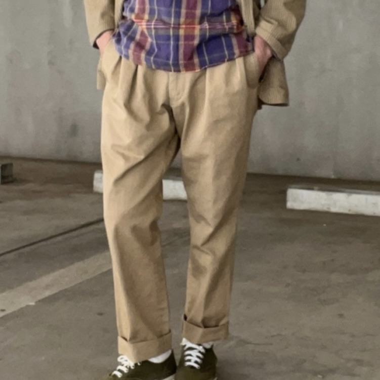 シルエットは直線的、パイプ・ステムというのは、いわば煙突状シルエット、太ももから裾口にかけて、ほぼ直線になっている。バギーやテーパードでは、アイビーのジャケットに合わない。側線にもステッチが入る。