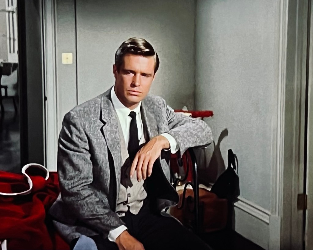 アンソニー・パーキンスの写真より、J.Press のフラップ・ポケットシャツに、黒のスリム・ニットタイ、肩線のステッチを含め、洗いざらしシャツのステッチの味わいが、よく理解できる。